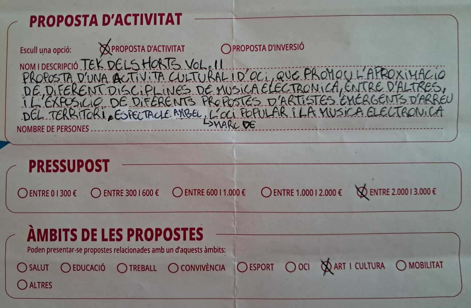 Pressupost de la teva proposta: (entre 0 i 300€ / entre 300 i 600€ / entre 600 i 1.000€ / entre 1.000 i 2.000€ / entre 2.000 i 3.000€): entre 2.000€ i 3.000€