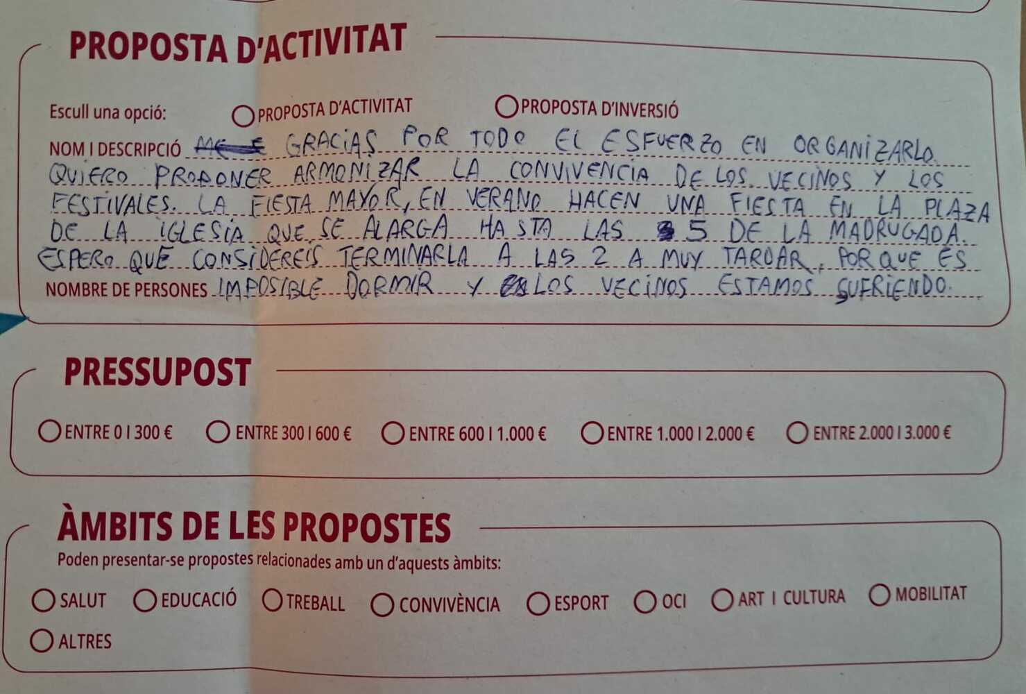 Descripció de la teva proposta: Gracias por todo el esfuerzo en organizarlo. Quiero proponer armonizar la convivencia de los vecinos y los festivales. La fiesta mayor, en verano hacen una fiesta en la plaza de la iglesia que se alarga hasta las 5 de la madrugada. Espero que consideréis terminarla a las 2 a muy tardar, porque es imposible dormir y los vecinos estamos sufriendo.