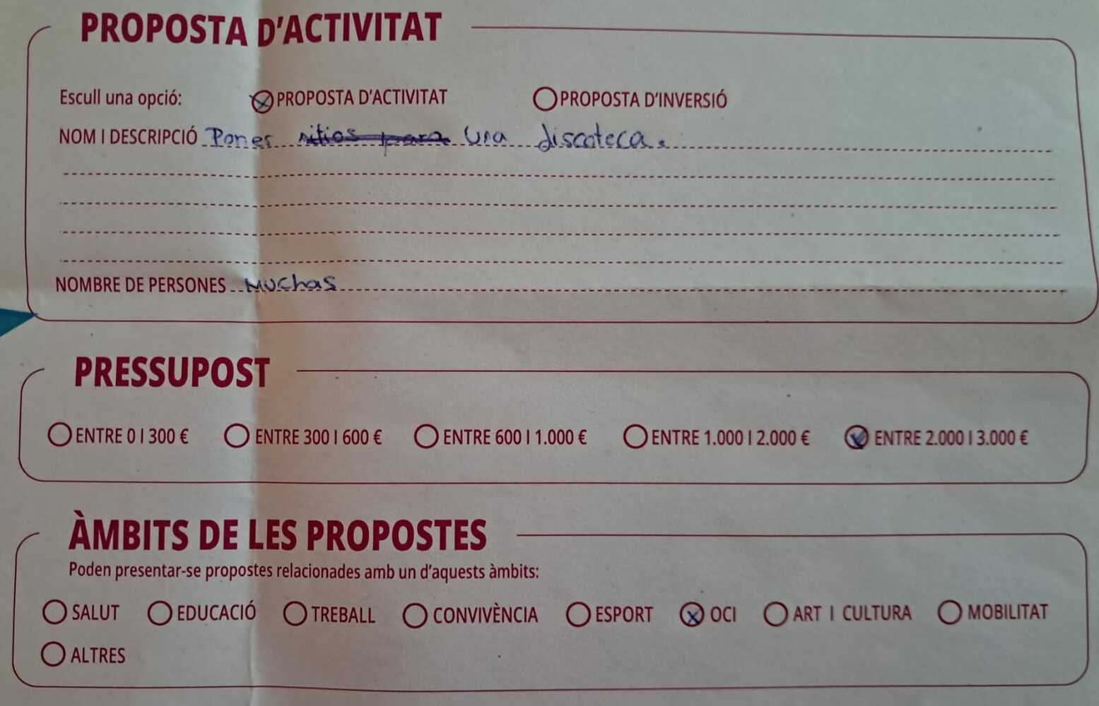 Descripció de la teva proposta: Poner una discoteca. Número de personas: muchas.